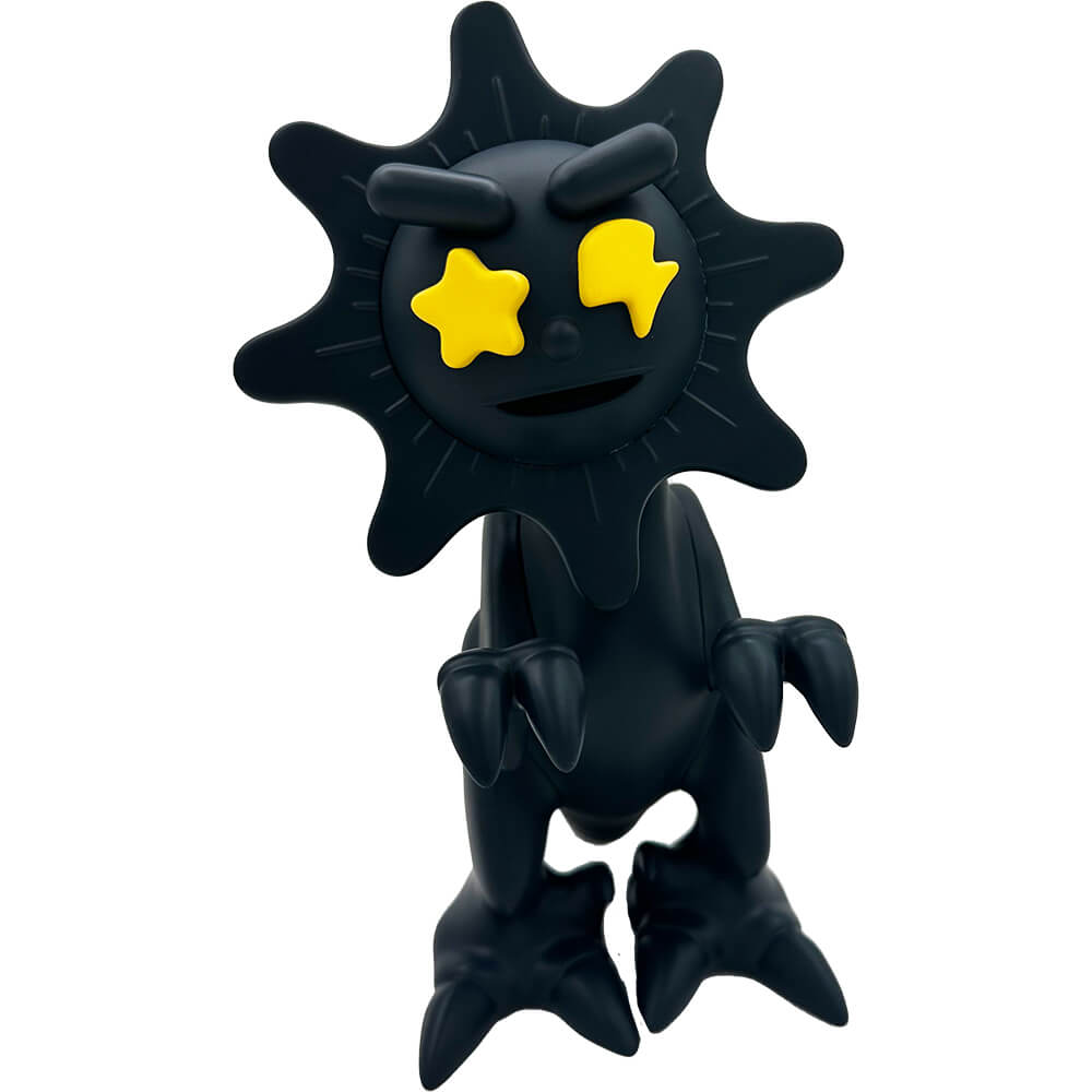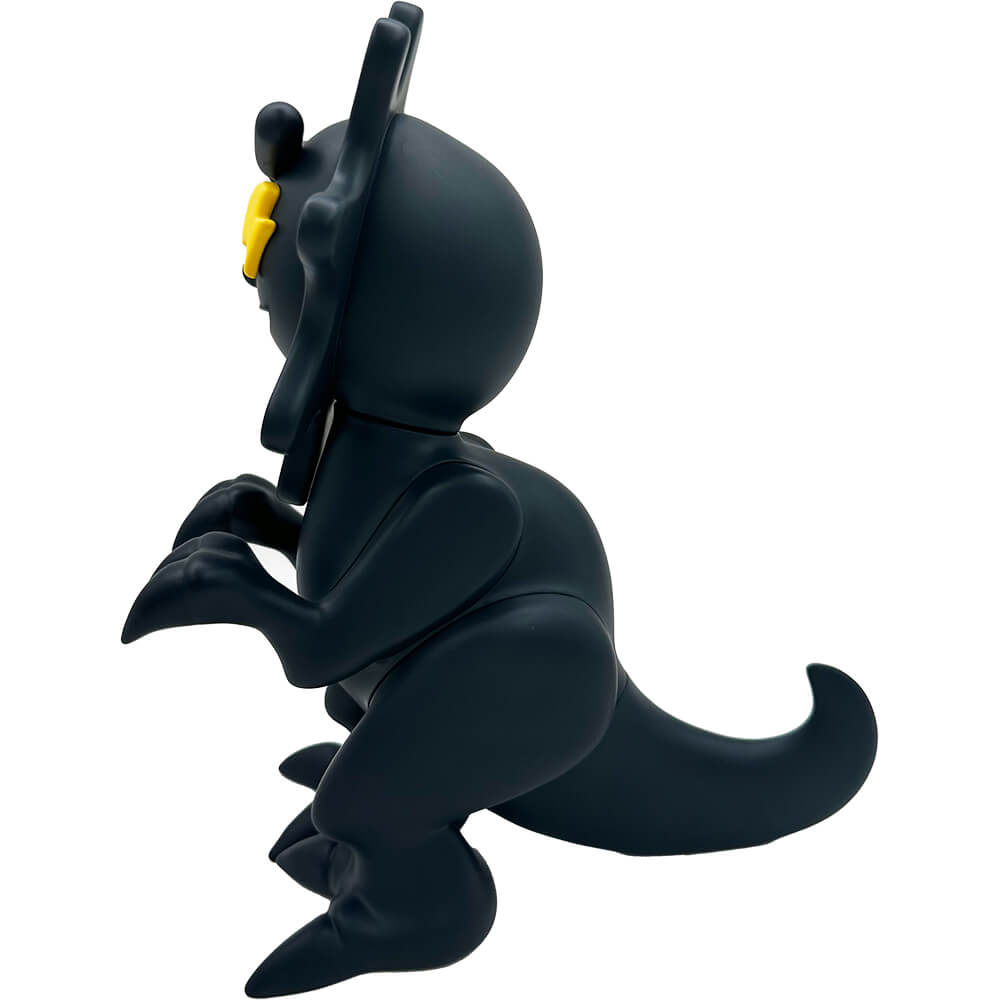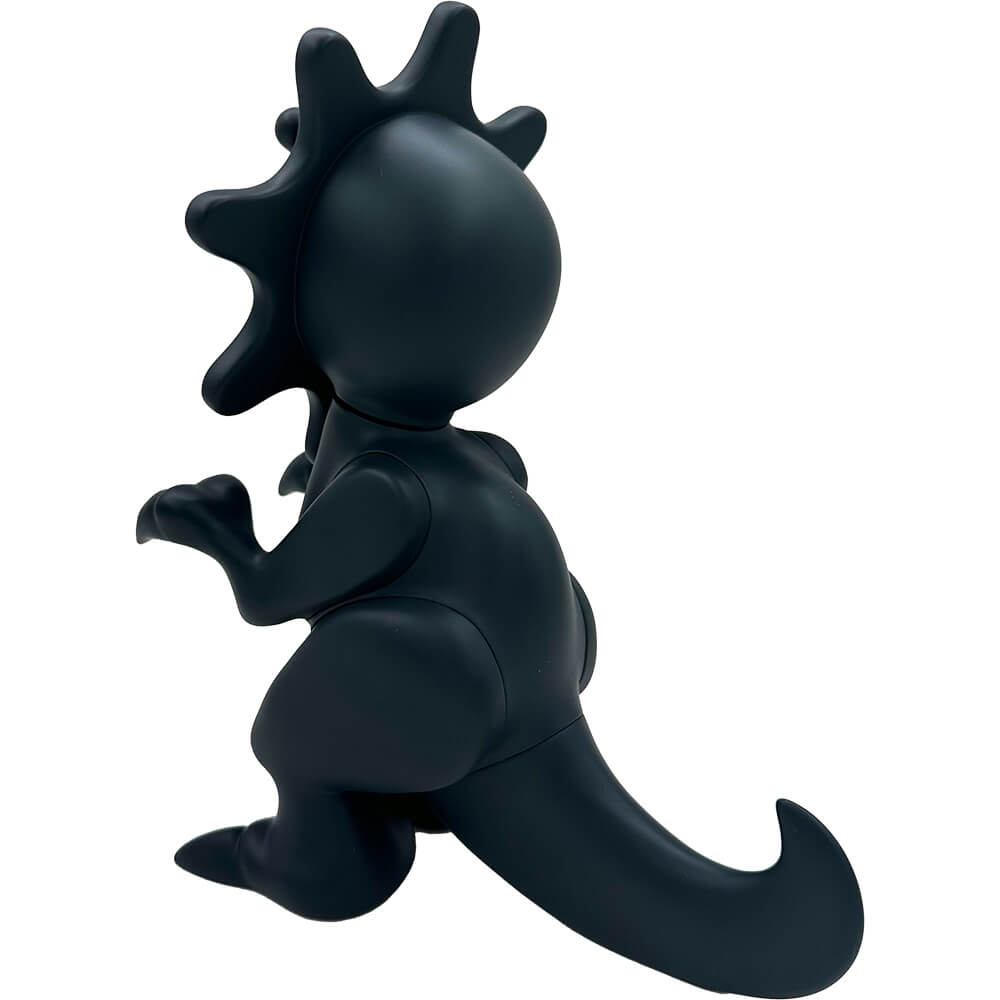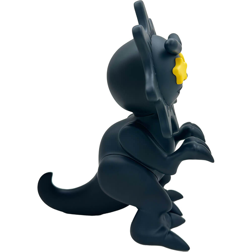 This vinyl “GLOW DINO blacked out edition” measures about 6 inches tall and comes in a laser cut foam protective box. The head is movable. Designed by Mula and Elbo, this blacked out colorway is limited to 100 pieces total.