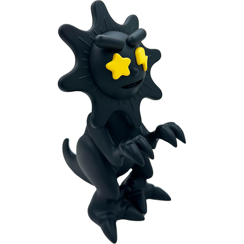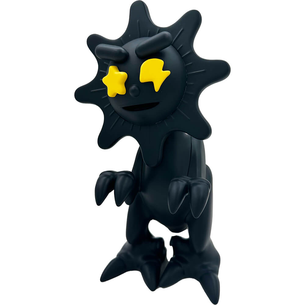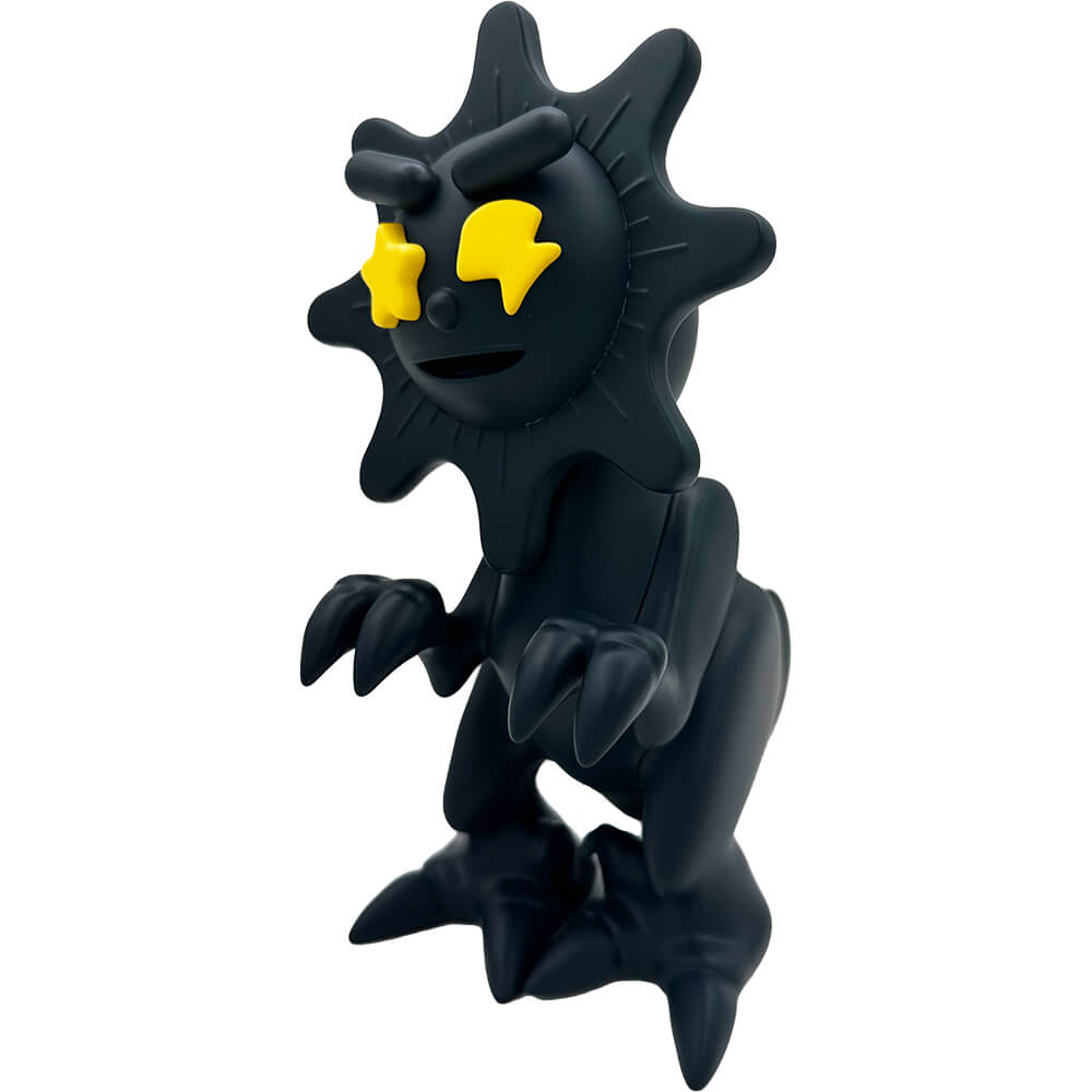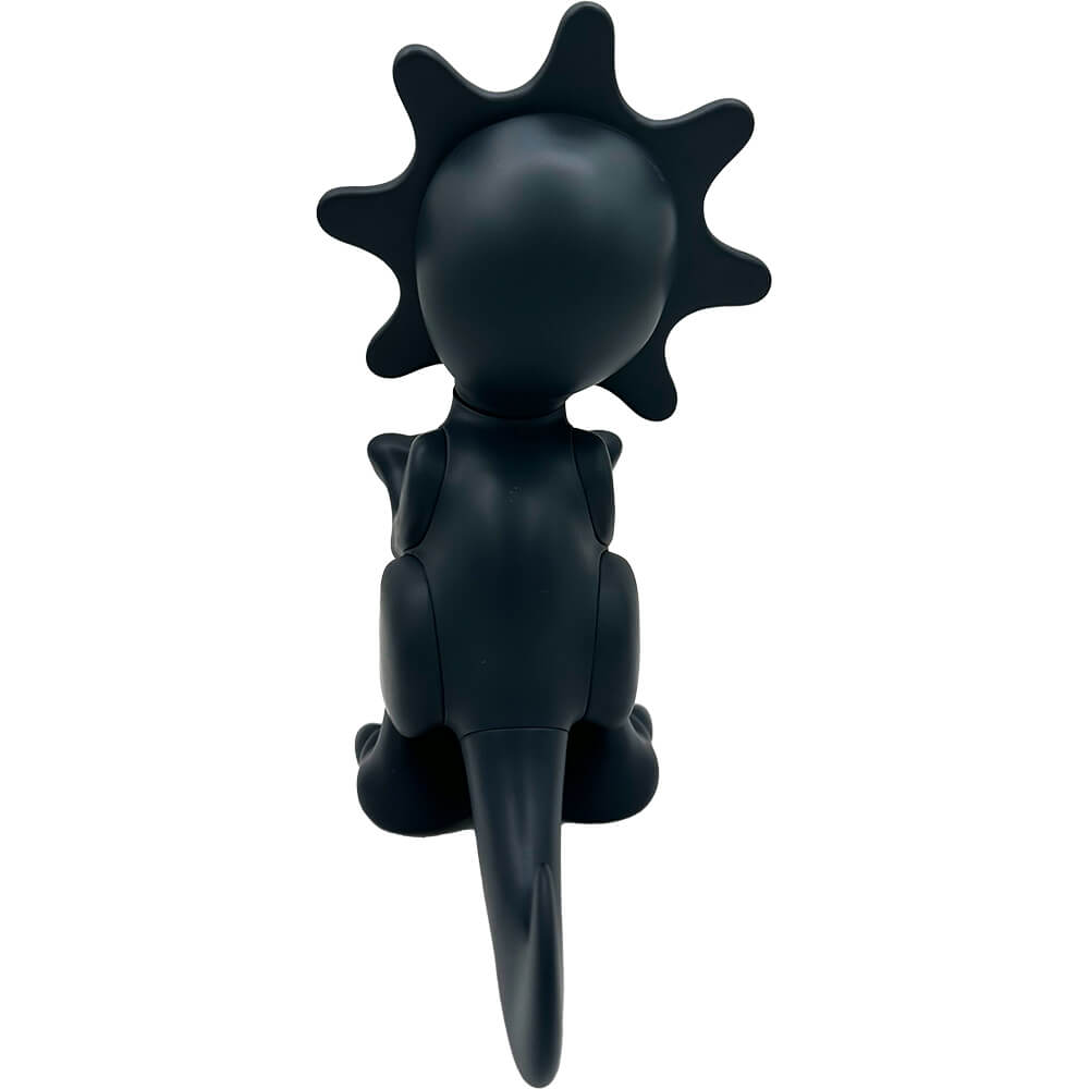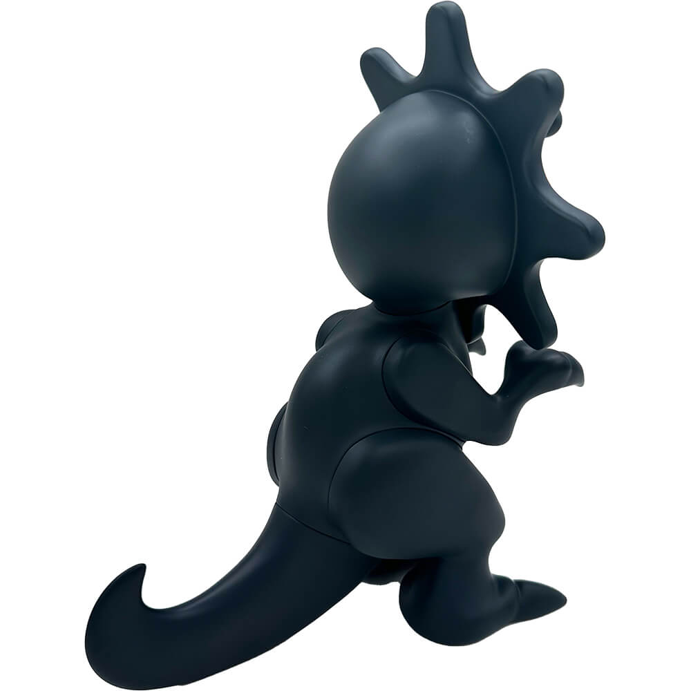 This vinyl “GLOW DINO blacked out edition” measures about 6 inches tall and comes in a laser cut foam protective box. The head is movable. Designed by Mula and Elbo, this blacked out colorway is limited to 100 pieces total.